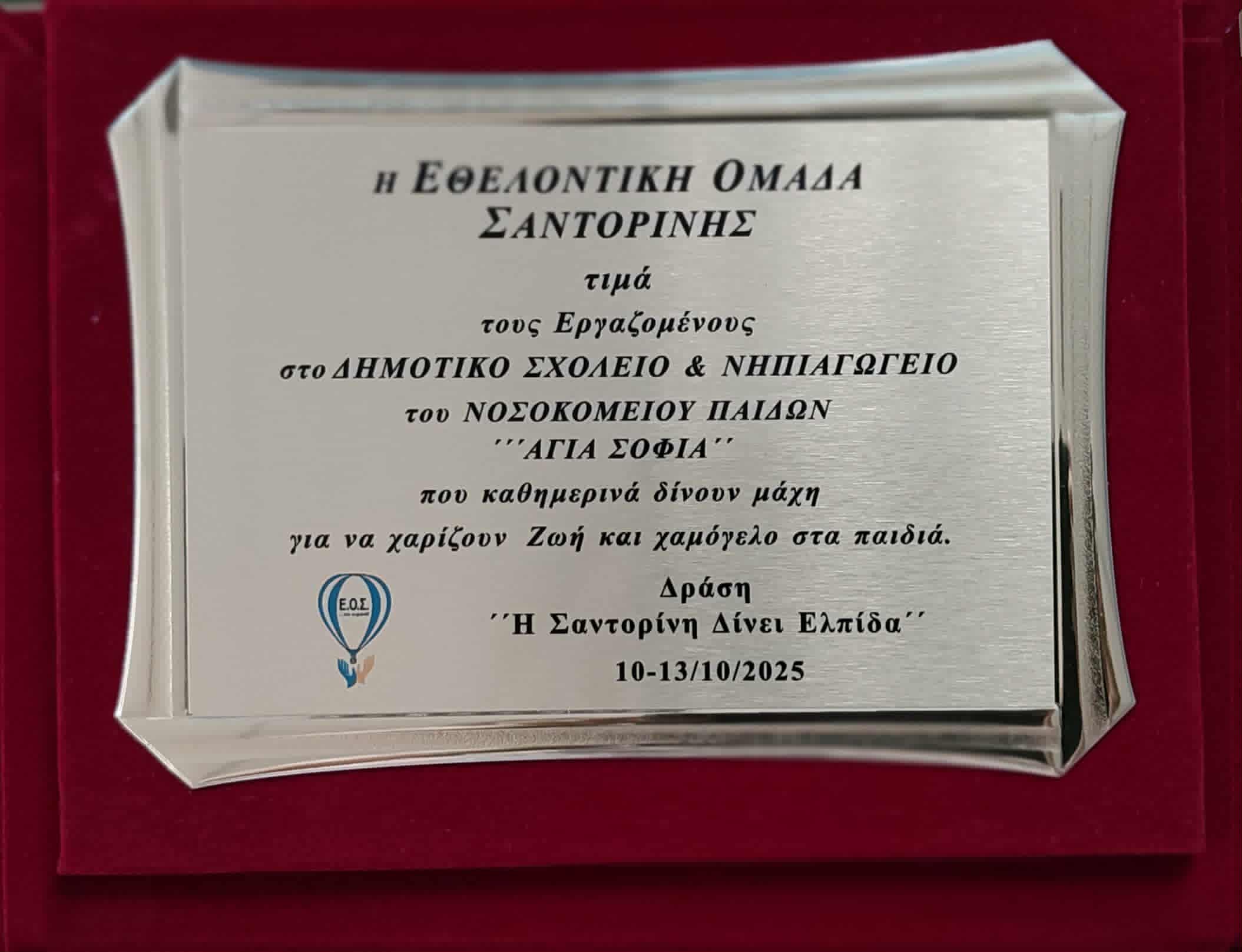 Ένα μεγάλο ευχαριστώ από όλες και όλους τους εκπαιδευτικούς του Νηπιαγωγείου και του Δημοτικού Σχολείου του Νοσοκομείου Παίδων «Η Αγία Σοφία» προς την Εθελοντική Ομάδα Σαντορίνης, για τη συγκινητική πρωτοβουλία και την εξαιρετική φιλοξενία που μας προσέφεραν στο νησί τους, κατά το τετραήμερο 10–13 Οκτωβρίου 2025. Είμαστε ευγνώμονες για την τιμή που μας έγινε, στο πλαίσιο της βράβευσης όσων συνεισφέρουν καθημερινά στον ευαίσθητο αυτόν χώρο: των ιατρών, των νοσηλευτών και των εκπαιδευτικών. Η τελετή της βράβευσης πραγματοποιήθηκε στην αίθουσα εκδηλώσεων του ΚΕΔΑ ( Κέντρα Ετοιμότητας Διασποράς Αεροπορίας - Πολεμική Αεροπορία), παρουσία του Δημάρχου, φορέων και εκπροσώπων της Τοπικής Αυτοδιοίκησης Σαντορίνης. Στο τέλος της παραμονής μας, δεν είχαμε παρά να εκφράσουμε, για άλλη μία φορά, την ευγνωμοσύνη μας και να συγχαρούμε τους διοργανωτές και όλους όσους συνέβαλαν στην υλοποίηση αυτής της πραγματικά ιδιαίτερης δράσης φιλοξενίας — δώρο για όλους μας, ένα βίωμα που θα μας μείνει αξέχαστο!